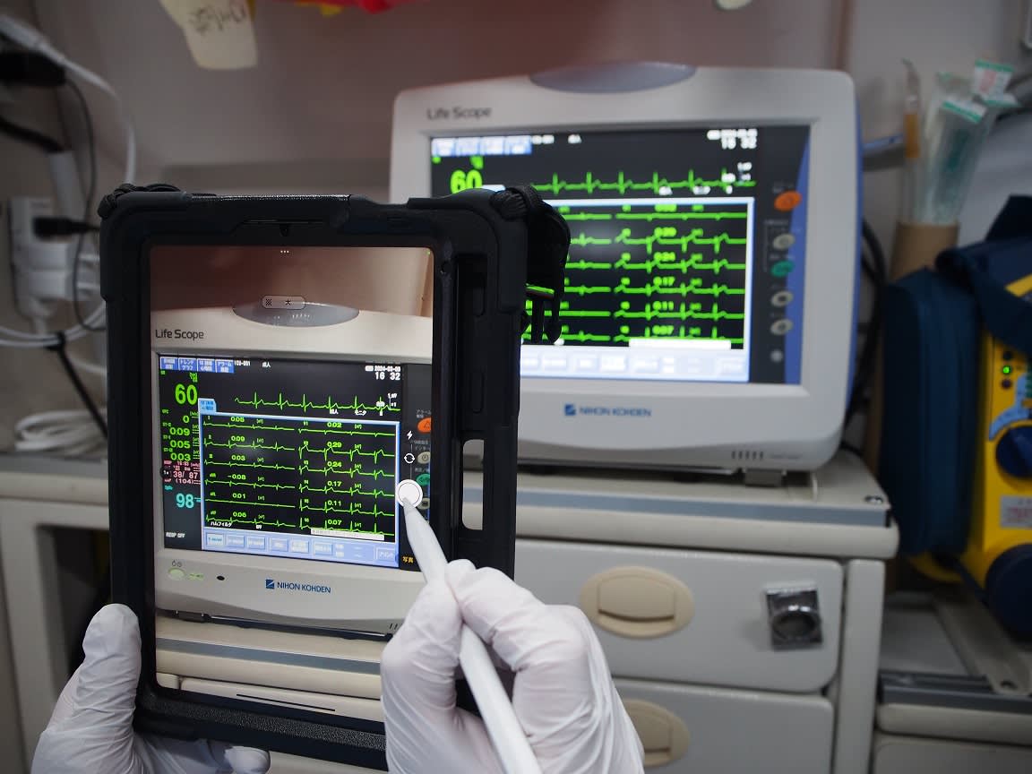 医療機関には、それらの情報を送信した直後に電話をかけ、受け入れの可否を確認。病院に向かう救急車内では、追加の情報を入力し、救急隊員が得た情報を医療機関に送信します。搬送先医療機関では、患者情報を院内で共有が可能で、電子カルテに反映させることもできます。