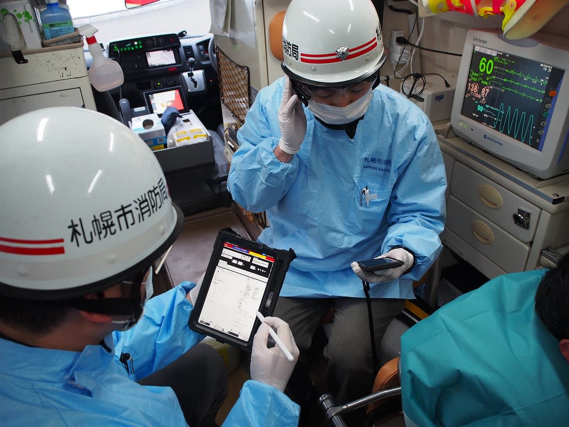 救急隊が病院へ傷病者の受け入れを要請する際、以前は救急車内で患者からヒアリングした手書きのメモをもとに、電話で患者説明のプレゼンテーションをしていました。現在は、モバイル端末に入力した情報を病院に送信します。これにより情報伝達の精度が上がりました。文字情報に加え、現場の写真も前もって共有できるので、病院側は患者の症状や重症度を多くの情報から推測できます。救急隊の到着前に適切な検査や処置を予測し、その準備を整えることができるのです。