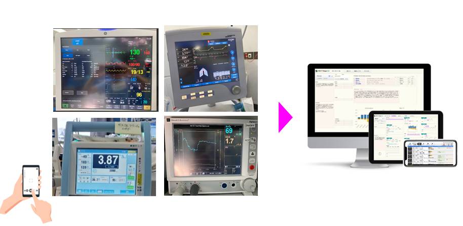 検査データ、医療機器情報をカルテ等から抽出あるいはモバイル端末でベッドサイド入力