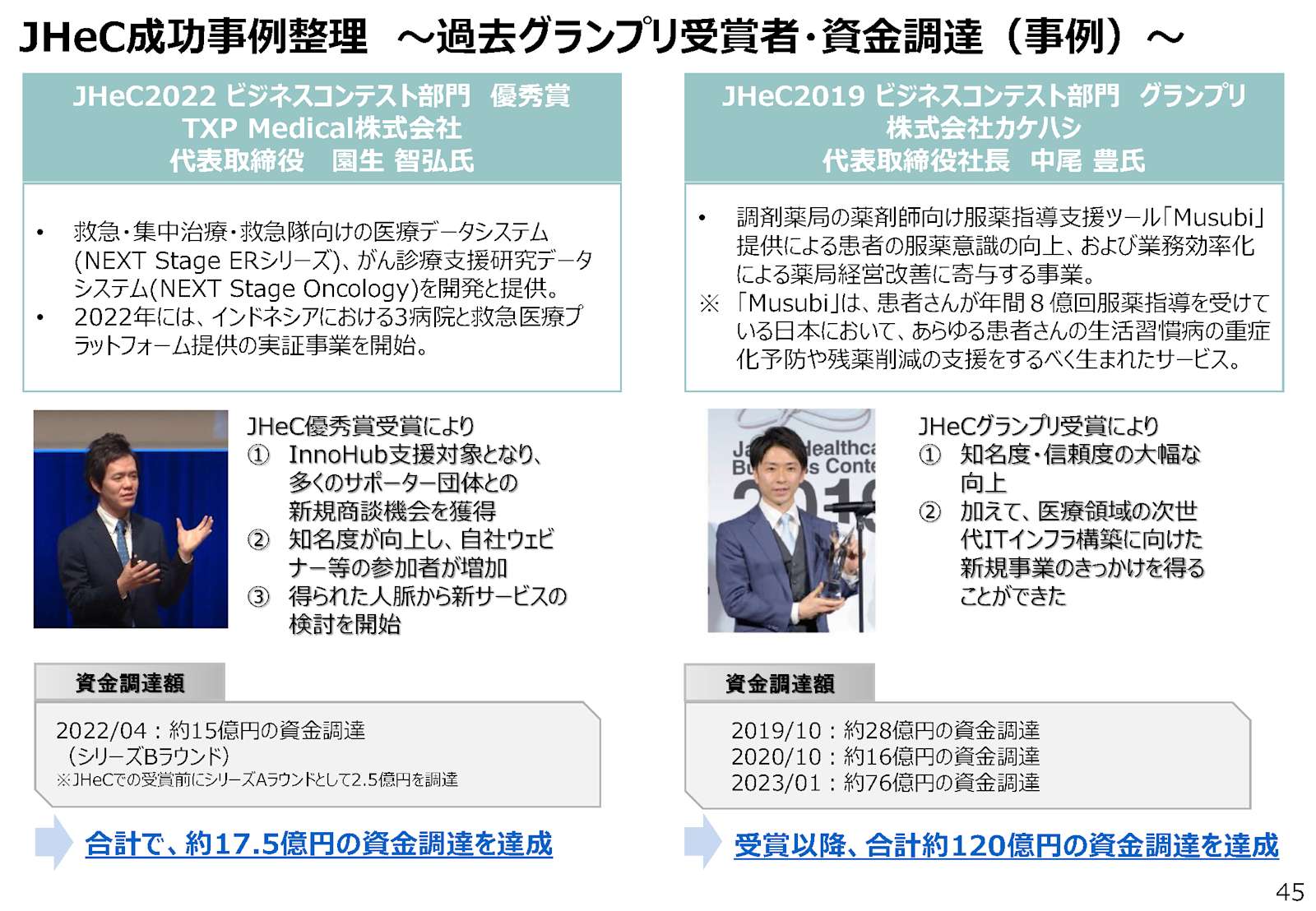 JHeC成功事例として、TXP Medicalがビジネスコンテスト部門において優秀賞を受賞した事例が、経済産業の健康・医療新産業協議会、第3回 新事業創出ワーキンググループで紹介されています。