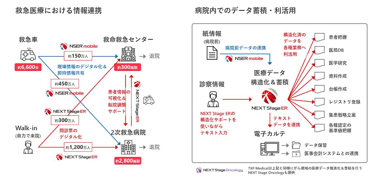 TXP Medicalは救急医療現場における医療情報の分断を解決する企業です。救急現場と病院間における情報のバケツリレー(紙・電話)をデジタル化し、病院の電子カルテ内の文章などの非構造化データを医学研究やその他業務に利用しやすい構造化データへ容易に変換するプロダクトNEXT Stage ERを病院向けに提供し、救急医療のデジタル化とデータに基づく医療の質改善を実現します。本プロダクトにより主訴や既往歴、臨床診断名、重症度スコアなどカルテテキスト内には存在するものの、文章の一部であるため利活用が困難であった詳細な医療データが活用可能となり、従来困難であった急性期領域における医療の質の可視化が実現されます。本プロダクトは救急搬送の受入数が多く、地域救急医療の要となる各地の救命救急センタークラスの大病院を対象としており、大学病院の救命救急センターセグメントではシェア20%を超え、蓄積される救急患者の情報は年間50万件を超えます。さらに、これらの病院と救急隊の即時情報連携を実現する入力支援AI機能を搭載したモバイルアプリNSER mobileを自治体向けに提供し、鎌倉市・豊田市など、全国での実利用を通じて適切な救急搬送先選定と救急搬送時間の短縮も実現しています。自治体や病院などのセグメントを横断したデータプラットフォーマーとして急性期医療の最適化を進めて参ります。