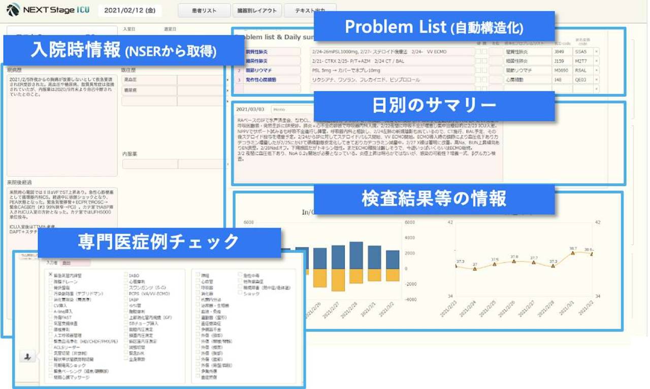 ICU入室~治療方針の策定・共有~日々のプロブレム(独自の言語処理辞書によりICDコード等の標準化データベースとして蓄積)管理とカルテ記載~引き継ぎ資料作成~臨床研究データベースの構築・レジストリ登録までを包括的に支援します。