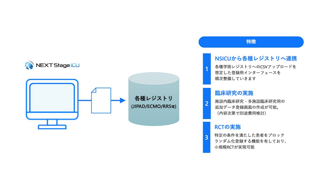 更に、収集したデータは全て臨床研究用データとして出力することが可能であり、各種学術レジストリ(JIPAD / ECMO / RRS等)登録用のCSVデータの出力も自動化しております。また、ブロックランダム化プログラムや臨床研究のCriteriaの組み込みも可能であり、RCTを含む前向き研究の基盤プラットフォームとしても機能します。