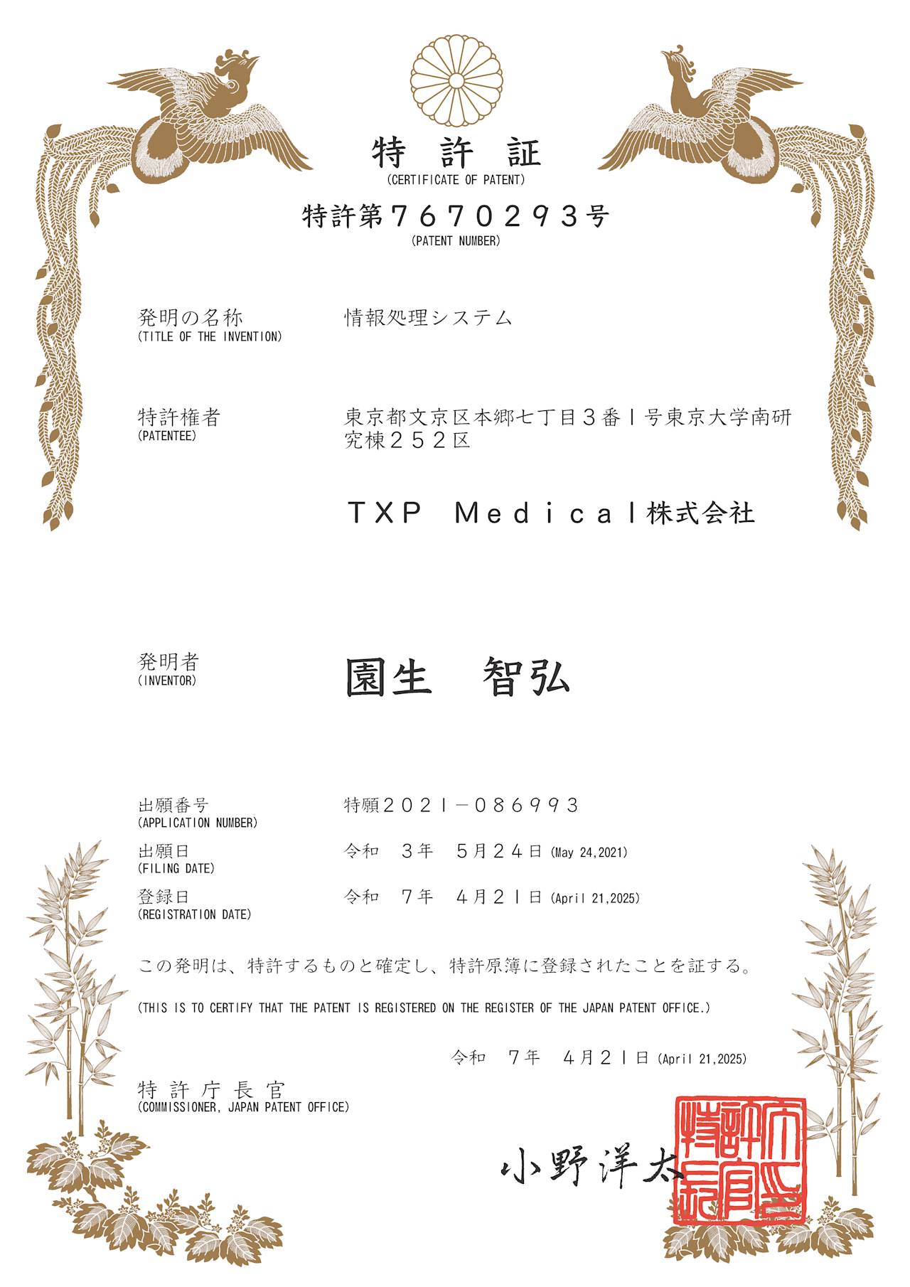 NEWSこの度、TXP Medicalは「情報処理システム」についての特許を新たに取得いたしました